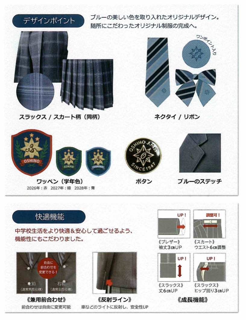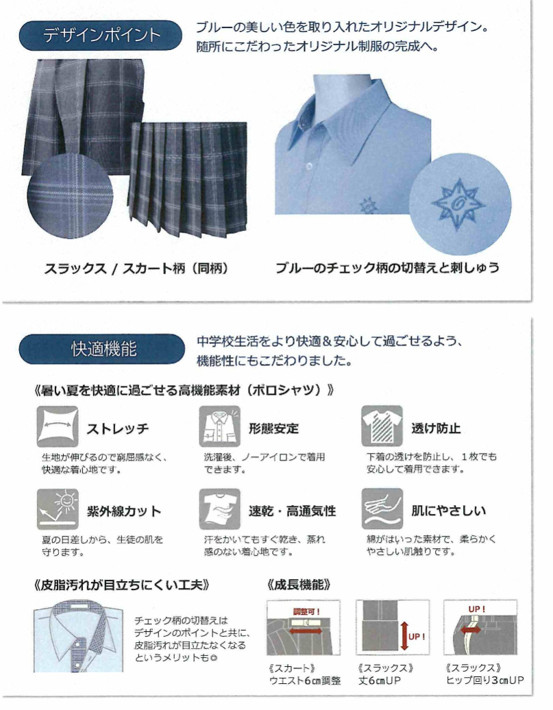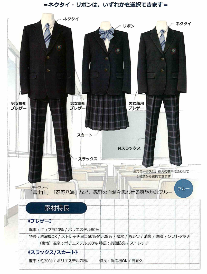 性に関係なく、スラックス、スカート、ネクタイ,リボンを選択できます。